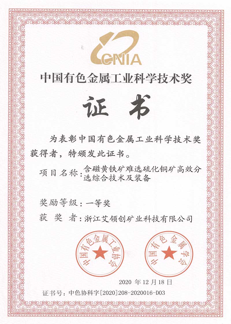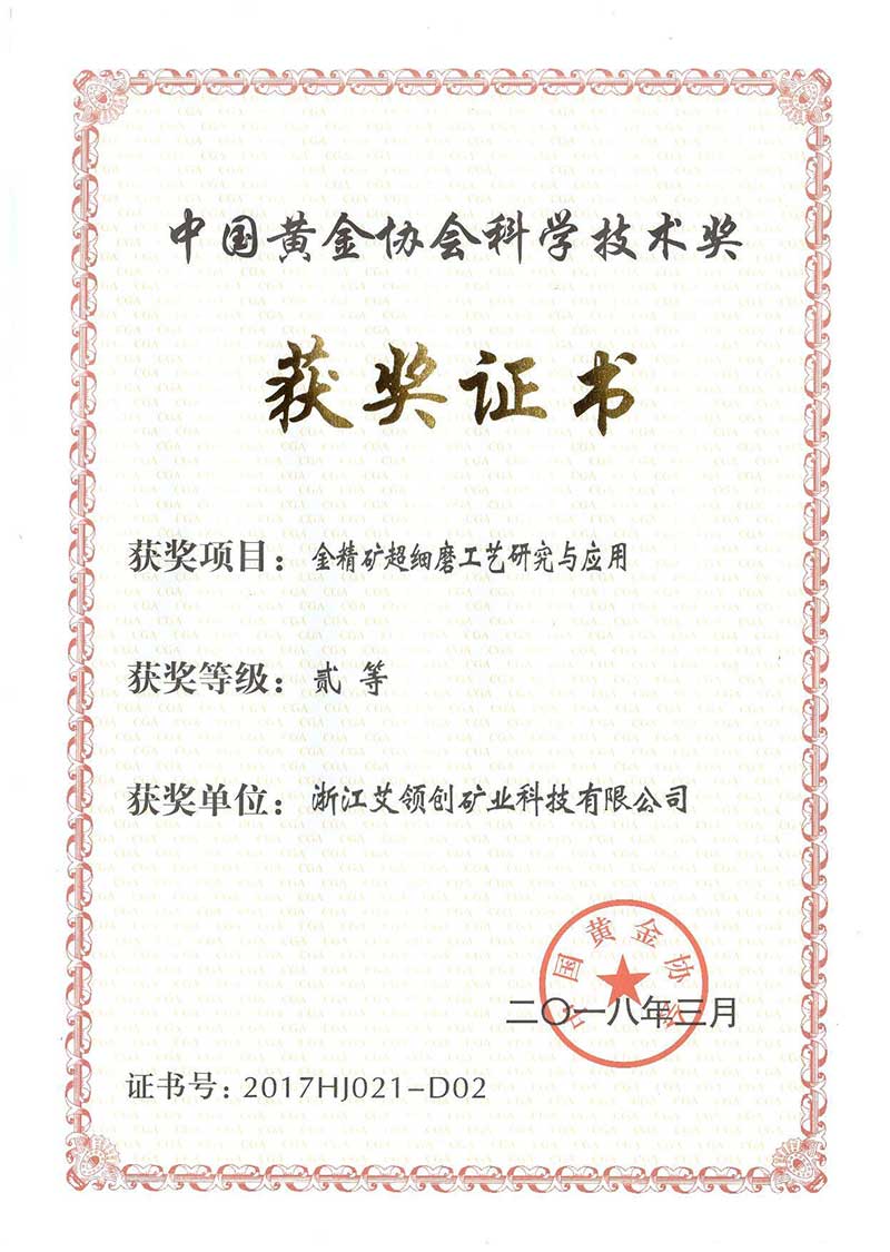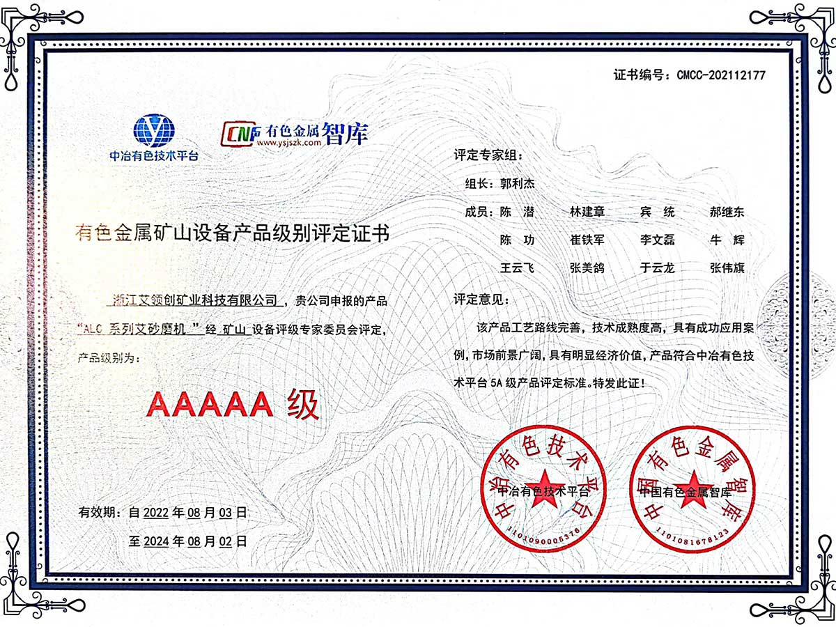 有色金属矿山设备产品级别评定证书-艾砂磨机