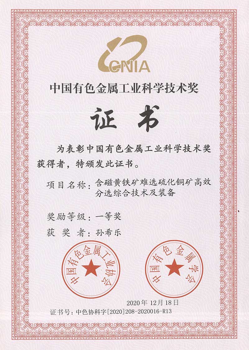 中国有色金属工业科学技术奖个人一等奖-孙希乐
